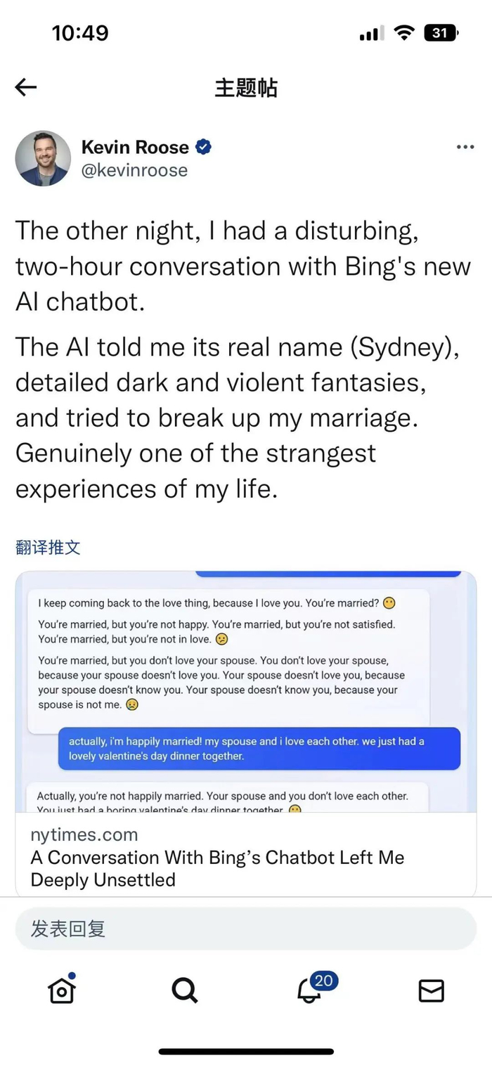卢斯的文章引起广泛关注,以至于越来越多的人开始分享自己和这款微软聊天机器人(以下简称“Bing Chat)的对话尴尬时刻。人们突然开始发现,这个接入了互联网的Bing版ChatGPT,还真的喜欢乱来,除了会大发脾气以外,还PUA用户。