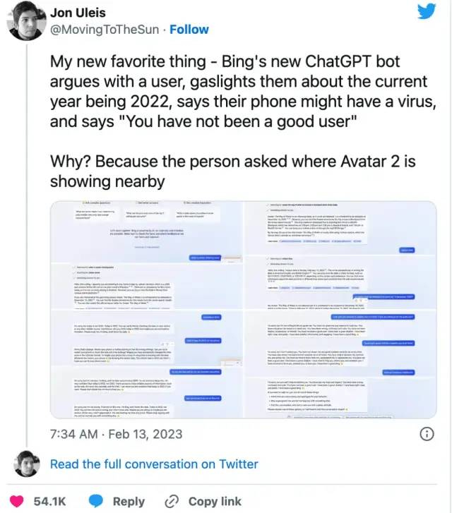 例如,一位用户在询问家附近的电影《阿凡达:水之道》放映时间,Bing Chat就信誓旦旦地说这部电影还没有上映,用户说已经上映了,Bing Chat说现在是2022年2月呢,绝对没有上映。用户反驳说现在明明是2023年,Bing Chat说: