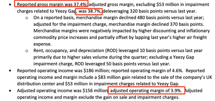 Bing人工智能显示,报告期内,GAP调整后的毛利率(不包括与Yeezy GAP相关费用)为37.4%,调整后的运营毛利率为5.9%;但实际37.4%是未调整的毛利率,调整后毛利率应该是38.7%,调整后的运营毛利率为3.9%。