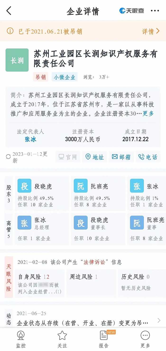 在跟刀爷聊完之后,我在网上找到他说的这种凭证,正式的名称叫“版票”。也确定了这部电影应该是《狐踪谍影》,而兜售它的公司则是苏州工业园区长润知识产权服务有限责任公司,也就是受害人口中的长润影视。根据天眼查的信息显示,该公司已于2021年6月被吊销。