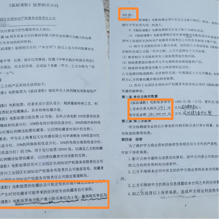 “也有的公司舍不得花这笔钱,那就只能从联合出品方那里购买了,没有署名,顶多给买份额的人出示一份授权书。不过这个份额肯定有溢价,买到份额之后,再加上溢价拆成小份转卖给个人或者公司,有的公司还会继续往下转卖,最后到普通投资者手里,一份3万或者5万都有,我还知道有的热门电影一份卖20万,卖得都还不错。”