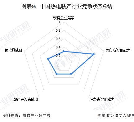 从五力竞争模型角度分析,目前,我国热电联产行业企业数量虽然在不断增长,但全国能源供给仍有不足,随着各行各业的进步,未来能源需求预计呈现继续增长的趋势,竞争并不激烈;在对上游议价方面,煤炭和天然气等产品受众多宏观因素影响,上游的议价能力较强;同样的,民众并不参与电力及供热的定价,下游议价能力较弱;在潜在进入者方面,市场仍需更多电力及暖气的供应,潜在进入者对目前市场的威胁较小;替代品方面,在碳中和的大环境下,燃煤的替代需求较高,但国家仍支持生物质发电等清洁能源,行业内对燃煤产品的替代性较高,但其他能源供给方式对热电联产的威胁一般。