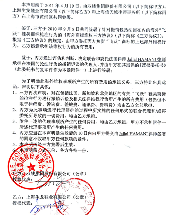 “双钱认可之前轮胎公司和老大孚给刘网生的“飞跃”授权,也认可他对飞跃鞋品牌延续所做的贡献,因此,双钱在收回“飞跃”商标后,继续给刘网生的生龙公司和新大孚持续授权。但双钱的主营业务是轮胎,并不做胶鞋业务,加上飞跃商标在国内的权利状态又没有问题,对于是否有必要去海外维权,双钱是犹豫的。当时,刘网生提出他知道国企的难处,他愿意由生龙公司出钱请律师去海外维权。在这个背景下,双钱便授权了刘网生进行飞跃鞋的海外商标维权活动。据我所知,这个维权之路也困难重重。”