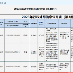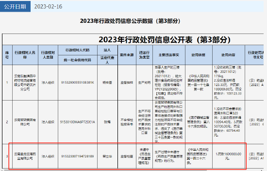 2月16日,云南省药品监督管理局发布2023年行政处罚信息公示数据(第3部分),云南盘龙云海药业有限公司因生产过程中未遵守《药品生产质量管理规范》,被罚款160万元。