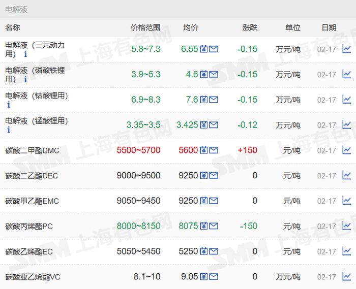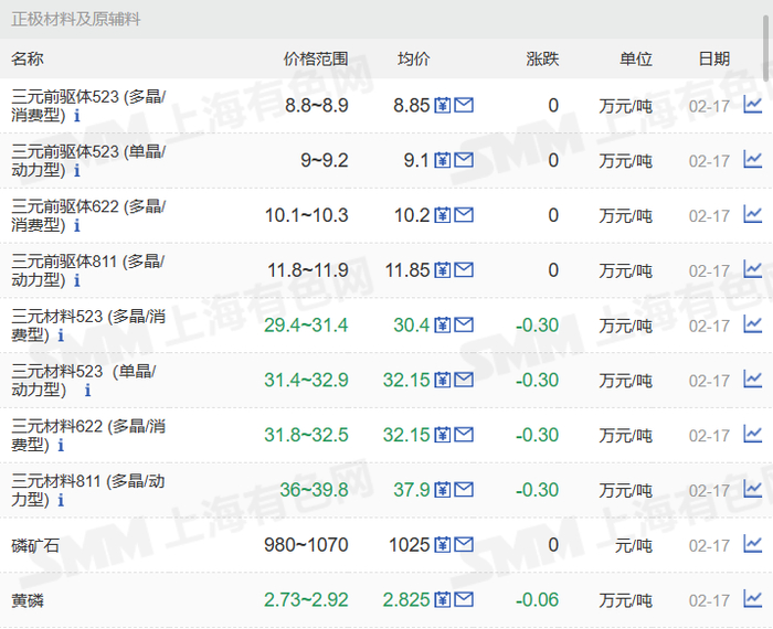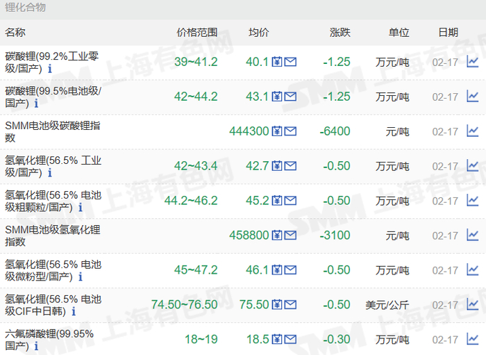 根据上海有色网数据,截至2月17日,电池级碳酸锂均价43.1万元/吨,工业零级碳酸锂均价40.1万元/吨;电池级氢氧化锂(56.5%国产粗颗粒)均价45.2万元/吨,工业级氢氧化锂均价42.7万元/吨。三元材料方面,523多晶、523单晶、622多晶、811多晶均价分别报每吨30.4,32.15,32.15,37.9万元。