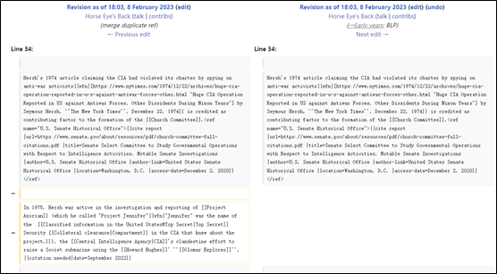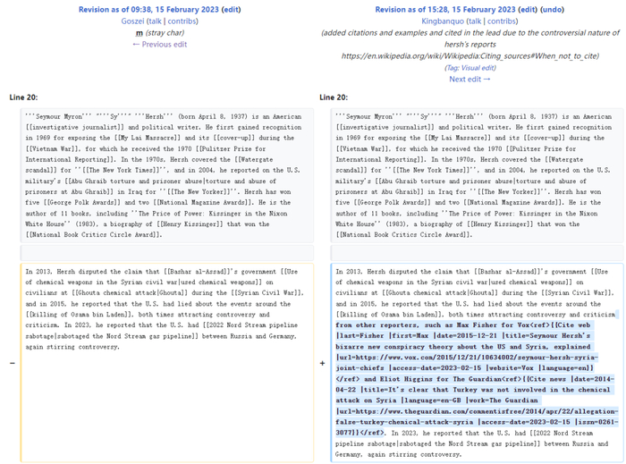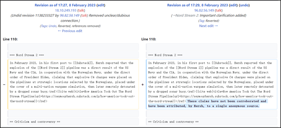 除了这几轮修改外,自2月8日到今天,赫什的个人介绍里还有许多删改也很有意思。在赫什揭露“北溪”爆炸的文章火了之后,词条把这篇报道作为他的重要作品收录在了他的职业经历介绍里,而不到2分钟后,就有人对这篇报道加了一个补充,称“北溪”管道是被美国主导炸毁的说法“尚未得到证实,消息全来自于一位匿名人士”,试图削弱这篇报道的公信力。