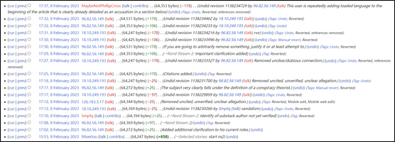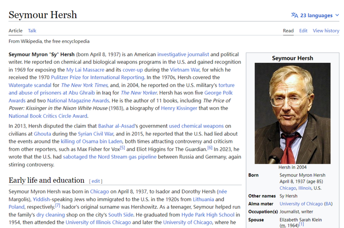 北京时间2月8日傍晚,赫什在个人网页上发布了调查报道《美国是如何毁掉北溪管道的》没多久,他的维基百科词条内容就出现了频繁的删改。当天下午5点开始,赫什这个词条的编辑频率已经加速到了以分钟计算的程度。
