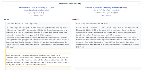 在一段关于赫什对冷战时期新闻的调查里,新版本删掉了美国中央情报局对苏联展开心理战的描述,而且没有给出删除理由。