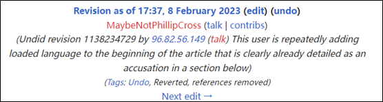 半个小时后,两边甚至相互在编辑页面警告起了对方。坚持给赫什加上“阴谋论者”一词这方表示:“如果你们要删掉这个词,那就拿出证据,或者至少假装有证据也行”;而另一方则坚持阴谋论的问题(实则是赫什的一次报道失误)“在下文中已经提到过了”,认为不该放在介绍开头作为对赫什的定性。