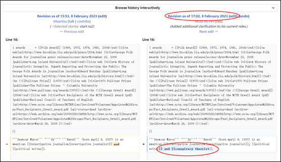 在查阅“西蒙·赫什”词条的编辑记录时,笔者发现了一些很有趣的事情。比如在2月8日17点02分时,赫什的职业介绍被人从“调查记者和时政作者”,额外加上了一个“阴谋论者”。
