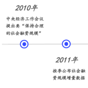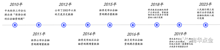 经过十余年的发展,社会融资规模指标已形成从季度到月度、从全国到分省、从增量到存量的全指标体系。下图展示了社会融资规模指标的诞生和发展过程。