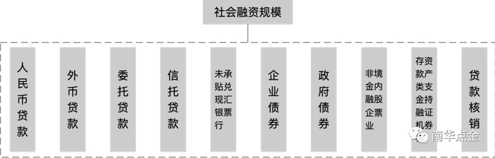 社会融资规模=人民币贷款+外币贷款(折合人民币)+委托贷款+信托贷款+未贴现的银行承兑汇票+企业债券+非金融企业境内股票融资+保险公司赔偿+投资性房地产+其他
