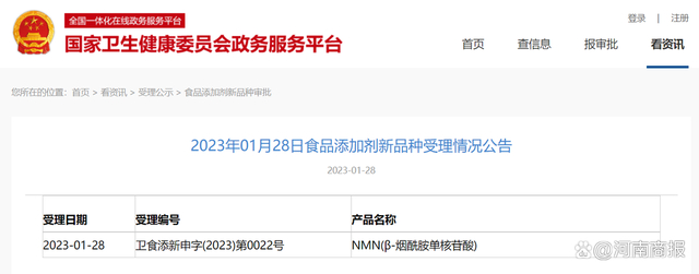 上月,NMN(β-烟酰胺核苷酸)物质可作为食品添加剂的申请正式被国家卫健委受理。这意味着,一旦该申请获批,NMN将可作为添加剂加入食品生产原料中。这是继去年3月,NMN可作为化妆品新原料的备案获得国家药监局通过后的又一“官方盖章”。