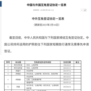 据中国领事服务网显示,截至2月16日,中华人民共和国与下列150个国家缔结互免签证协定。中国公民持所适用的护照前往下列国家短期旅行通常无需事先申请签证。