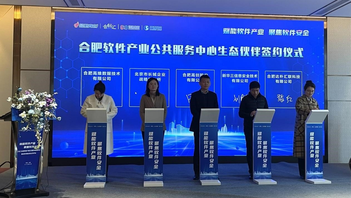 活动中,合肥软件产业公共服务中心与新华三、高维数据、亿格云、达朴汇联等8家企业签署生态合作协议;安徽产业互联数据智能创新中心、安徽长泰科技、安徽把浅信息等企业与合肥软件产业公共服务中心的数字经济软件供应链安全检测平台(徽软智服)进行了现场项目签约。