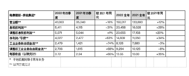 2022财年,通过进一步聚焦豪华乘用车和轻型商务车业务及严格的成本措施,梅赛德斯-奔驰推动其息税前利润显著增长28%至205亿欧元,营业额同比增长12%至1500亿欧元,全年净利润同比增长34%至148.1亿欧元。2022财年第四季度,梅赛德斯-奔驰营收达410亿欧元,同比增长16%,息税前利润为4.1亿欧元,同比增长31%。2月17日,梅赛德斯-奔驰发布2022财年财报数据,披露了上述信息。