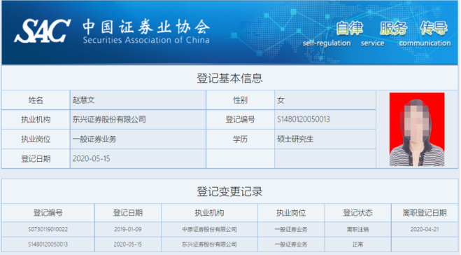 中证协官网从业人员基本信息公示显示,赵慧文在东兴证券执业的登记日期为“2020-05-15”,其较早在中原证券执业,登记日期为“2019-01-09”,从中原证券离职登记日期为“2020-04-21”,时间相隔仅仅1年3个月左右。