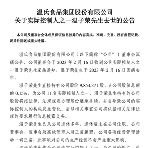 2月16日晚间,温氏股份发布公告称,公司董事会于2023年2月16日收到公司实际控制人之一温子荣先生家属通知,温子荣先生于2023年2月16日因病去世。