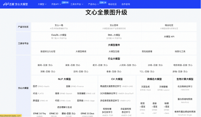 去年末,文心大模型迎来全面升级。在模型层一次性发布11个大模型,涵盖基础大模型、任务大模型、行业大模型的三级体系;工具与平台层,升级大模型开发套件、文心API和提供全流程开箱即用大模型能力的EasyDL和BML开发平台;新增产品与社区层,包括AI艺术与辅助创作平台“文心一格”、产业级搜索系统“文心百中”和旸谷社区面向个人用户。