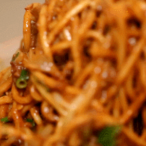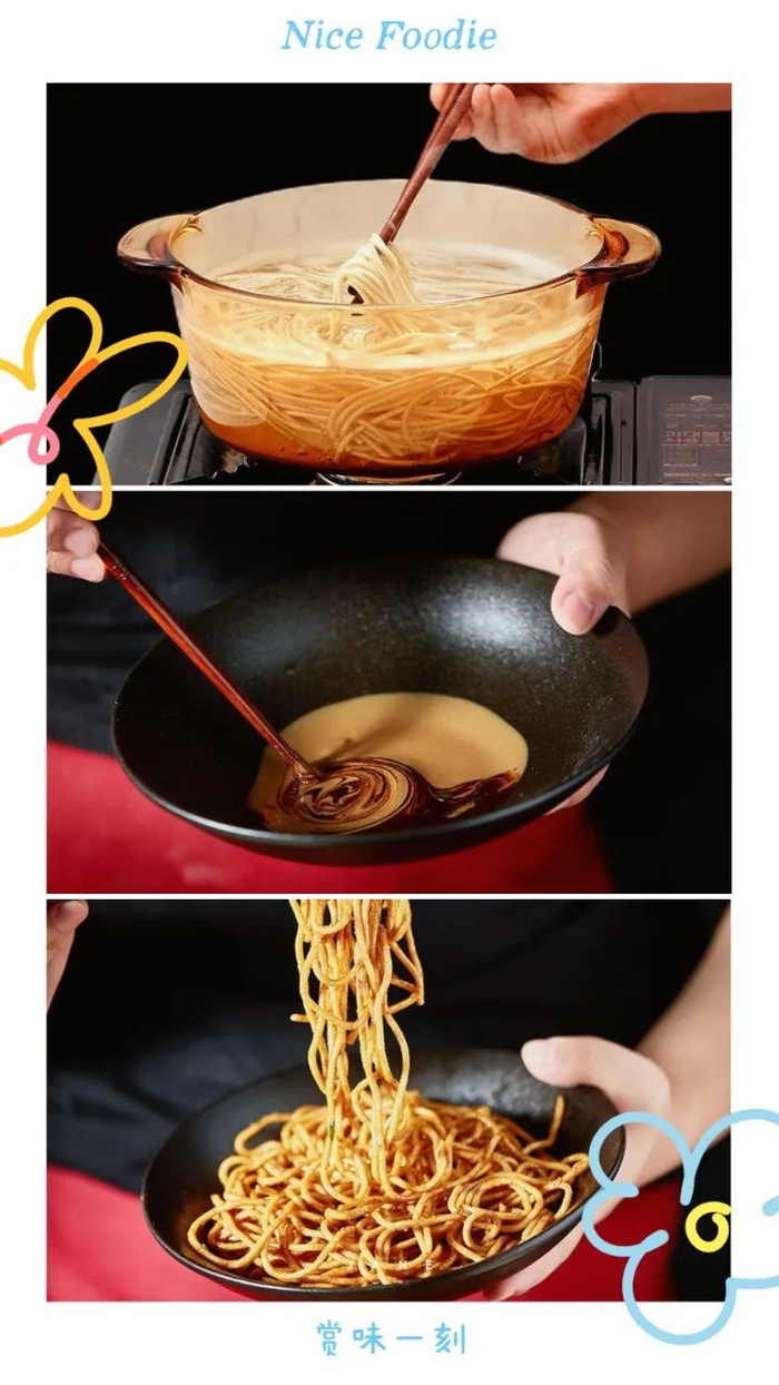 3、愉快拌面趁热拌面,筷子插到碗底,迅速挑面,来回翻拌,幅度越大,拌面越均匀,味道越好。