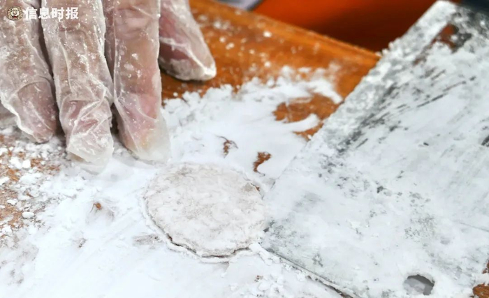宜姐一边说,一边在案板上撒上薄薄一层生粉,切下一小团鱼胶准备做“鱼皮”。她将像面团一样的鱼胶揉成长条状,再切成手指般长短的条状,最后切成骰子大小的剂子,用刀轻轻将鱼肉剂子压成薄片,蘸上生粉,鱼皮角的“鱼皮”就成形了。