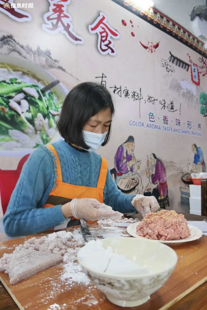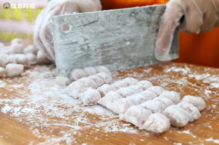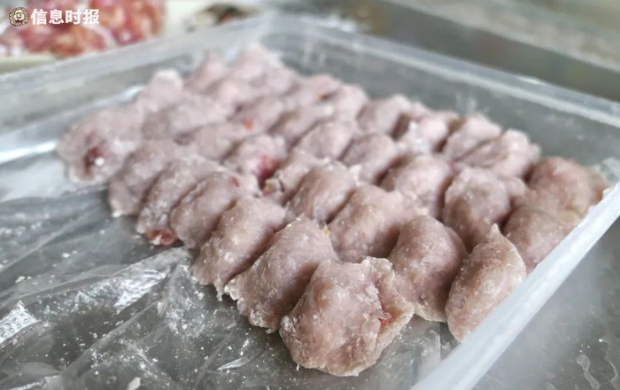 “做好的鱼胶可以放在冰柜中保存几天。”宜姐拿出提前准备好的鱼胶,只见其状态犹如和好的面团一样光泽细腻。宜姐表示,品质好的鱼胶,割开瞬间能看到切口有少许泛蓝,这颜色转瞬即逝,是品质好的鱼肉才有的光泽。正因如此,为了不破坏鱼胶的品质,切鱼肉的刀也有讲究。“金属做的刀切鱼胶容易让鱼胶染味变质,所以要用特制的小木刀处理鱼胶。”宜姐介绍。