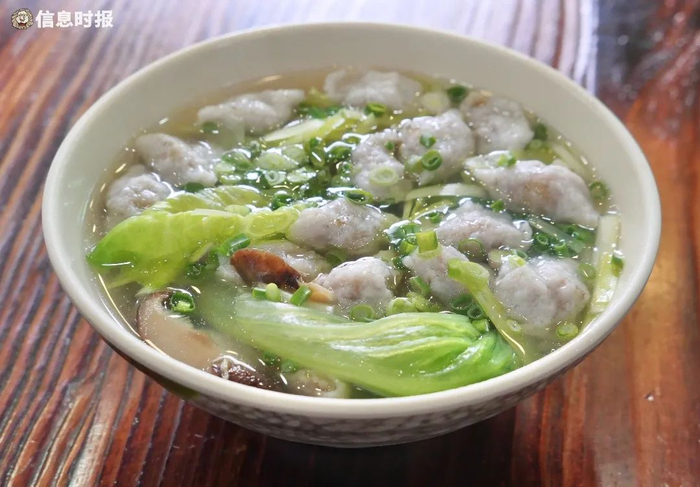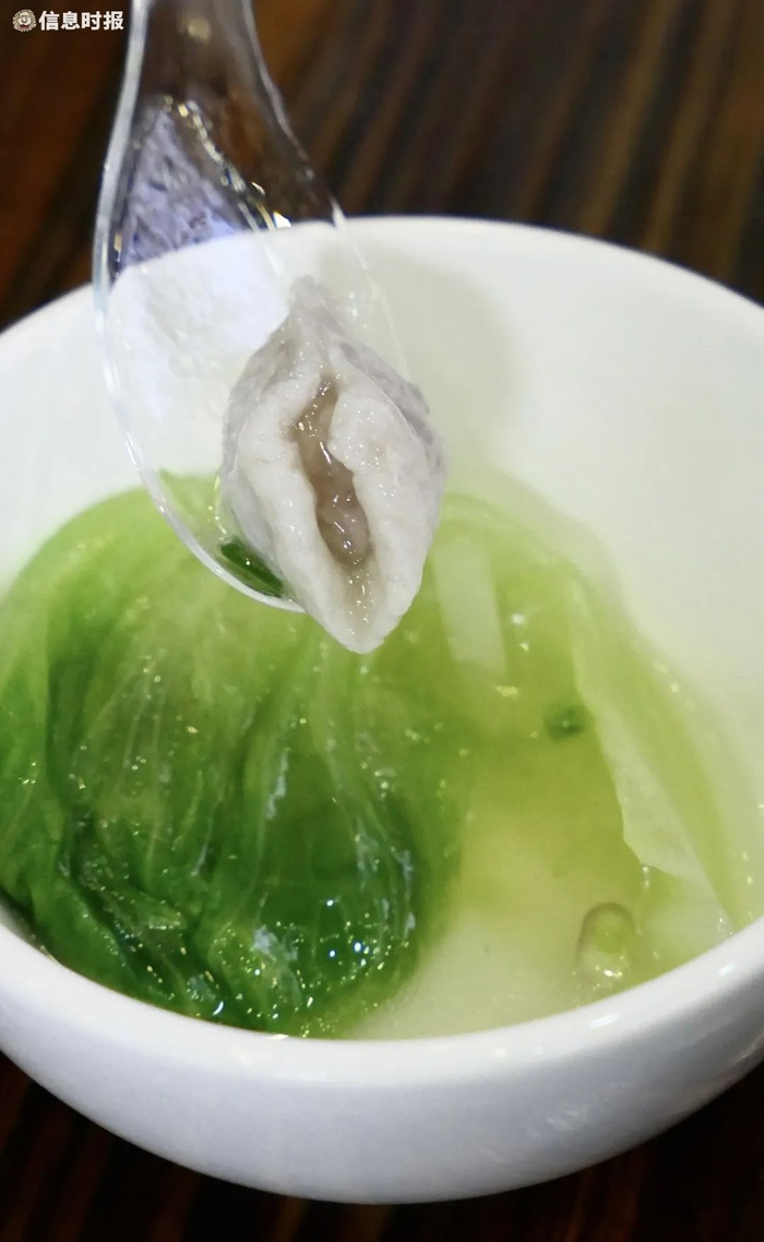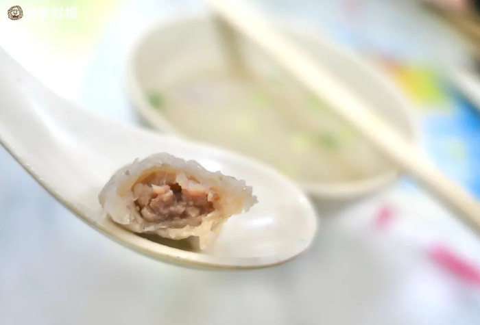 鱼皮角自带鲜味,因此宜姐认为,用加入韭黄、冬菇、生菜和少许葱花的清水煮的鱼皮角是最鲜美的。仔细品尝,食客能感受到鱼皮鲜甜的滋味,肉馅爽口弹牙,汤里还有浓郁的花生油香气,着实让人回味无穷。
