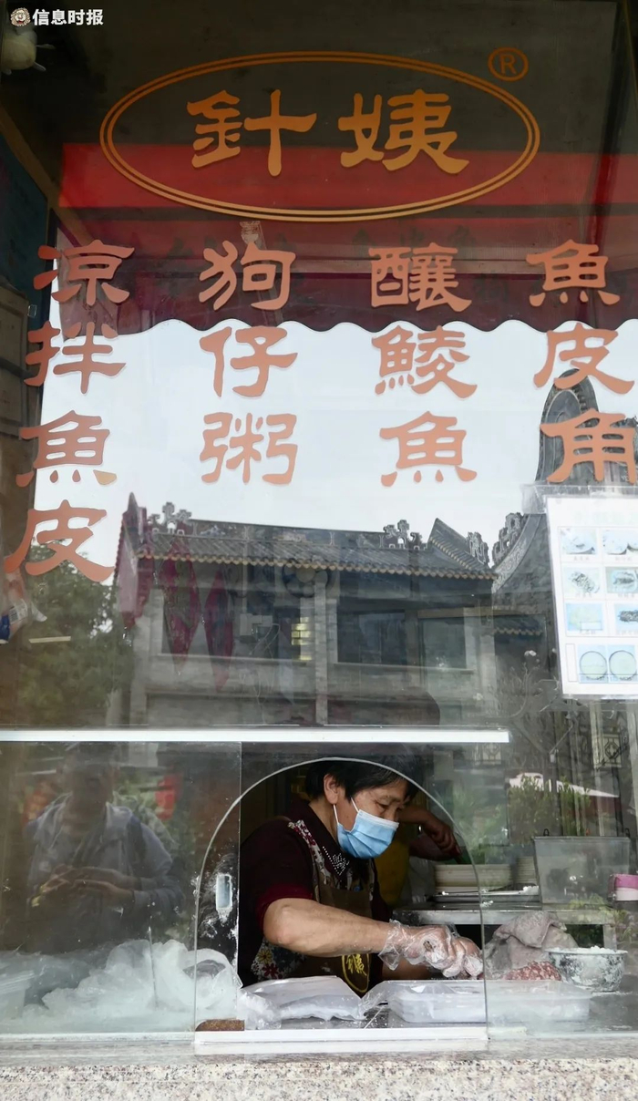 针姨既是店名,也是老板的名字。针姨在沙湾古镇也是当地饮食名片般的存在,狗仔粥、凉拌鱼皮、上汤鱼皮角……由针姨手工制作的小食总能吸引食客前来觅食。