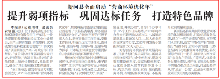 对标营商环境各项领域最高标准,开展达标任务巩固行动。新河县将围绕提高开办企业便利度、提高投资和建设便利度、提高纳税便利度、优化市场准入准营机制等21个目标,构筑亲商、重商、安商、暖商的服务环境,构建新型政商关系,不断提升发展质量和效益。