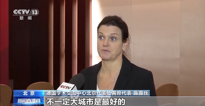 德国学术交流中心北京代表处首席代表施露丝:不一定大城市是最好的,也许小城镇更合适,它们更便宜,你可能有一个更好的师生比,你可能有一家很棒的公司,总部就在那里。如果中国学生去这样一所大学,你实际上会在德国或中国有一个好的职业生涯,因为有很多德国公司也在中国。