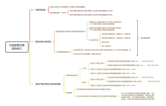 本次主板股票交易规则主要围绕三个角度进行。首先,在涨跌幅控制上,主板取消了已适用长达9年的“行业惯例”,取消了如“新股发行市盈率不超过23倍”、“新股上市首日涨幅限制为44%,跌幅限制为36%”的限制,参照科创板交易规则的规定进行了修订,首次公开发行后前五个交易日不设涨跌幅限制,使新股首发时的市场博弈更为激烈;同时,交易所修订了临时停牌制度来对此加以制衡,即使在收盘前该股票不会涨停/跌停,但每涨/跌至30%/60%,均会触发临时停牌10分钟;其次,在限制申报价格范围上,对于无涨跌幅限制的股票,成交价格也由买卖双方在当日产生的实时均价上下20%确定,且不得超过当日最高/最低成交价,而主板仍保持原有的日涨跌10%的限制,有利于保持股票交易价格稳定;最后,对于在短期内产生剧烈波动的股票,交易所将其标注为“严重异常波动”,并对其交易信息进行披露,上市公司也应及时核查并采取措施,切实维护股票市场总体走势稳定。