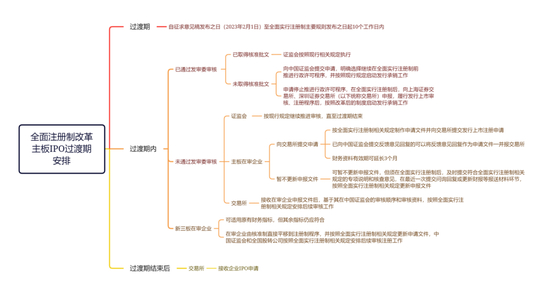 过渡期内已过会但未取得核准批文的企业,可以选择继续按原有规定推进上市程序,也可以申请停止原有程序,转向交易所申报,并按全面注册制改革后的新规履行审核、注册程序;过渡期内仍处于问询过程中的企业,可以按新规制作申请文件并向交易所申报,已向证监会提交的问询回复可以作为材料一并提交。在全面实行注册制新规尚未真正落地前,申报文件可以暂不更新,待新规落地后,在最近一次报送材料的环节中,由中介机构提交符合全面实行注册制规定的专项核查意见,并按新规更新申报文件。