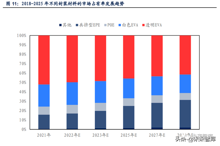 市场上封装材料主要有透明 EVA 胶膜、白色 EVA 胶膜、POE 胶膜、EPE(EVA-POE-EVA 共挤) 胶膜与其他封装胶膜(包括 PDMS/Silicon 胶膜、PVB 胶膜、TPU 胶膜)等。目前的主流是 EVA 胶膜,POE 胶膜在阻隔水汽能力、抗老化能力等方面表现突出。EPE 胶膜是 EVA 和 POE 共挤制备而成的,具备 POE 高抗老化能力、高阻隔水汽能力,同时 EVA 的加入也克服了纯 POE 胶膜加工性欠佳的问题,使得 EPE 胶膜兼具 POE 和 EVA 的优良性能。