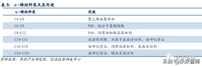 α-烯烃是分子端有双键的单烯烃,主流应用是与乙烯共聚,α–烯烃是重要的有机化工原 料和中间体,可以用作生产聚烯烃的共聚单体,也可用于生产高端润滑油、增塑剂、表面 活性剂等精细化学品。在 POE 的结构上,α-烯烃的加入起到了支化聚乙烯的作用,使得 POE 微观上同时具有塑料相和橡胶相,性能上同时具有热塑性和高弹性。作为聚烯烃共聚单体的α-烯烃,多为 C4-C8 烯烃,其中 1-丁烯、1-己烯、1-辛烯与乙烯 共聚可以制备高密度聚乙烯(HDPE)、线性低密度聚乙烯(LLDPE)和聚烯烃弹性体(POE), 用作高级润滑油的合成原料,用于生产增塑剂醇和洗涤剂醇等。还可与乙烯、丙烯共聚制 备丙烯/乙烯/丁烯三元无规聚丙烯,或者与丙烯共聚制备丁烯共聚聚丙烯等。