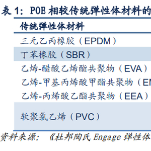 POE 与传统弹性体材料 EPDM、SBR 等相比有诸多优势,优异性能与其结构特点有关。POE 的 结构方面有以下特点:(1)α-烯烃(如辛烯)的柔软链卷曲结构和结晶的乙烯链作为物理 交联点,使其既具有优异的韧性又具有良好的加工性;(2)相对分子量分布窄,与聚烯烃 兼容性好,具有较佳的流动性;(3)没有不饱和双键,耐候性优于其它弹性体;(4)较强 的剪切敏感性和熔体强度,可实现高挤出,提高产量;(5)良好的流动性可改善填料分散 效果,可提高制品熔接痕强度。