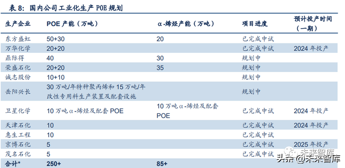 天津石化隶属于中国石化,成立于 1983 年 12 月 28 日。天津石化 POE 相关项目已开始建设。2022 年 03 月 22 日,中国石化天津南港乙烯项目土建 工程开工,标志着中国石化集团“十四五”期间,在南港工业区投资建设的天津南港高端 新材料产业项目集群迈入全新阶段。南港乙烯项目是中国石化南港高端新材料产业项目集 群的代表项目,以 120 万吨/年乙烯裂解装置为龙头,产业链延伸建设α-烯烃、超高分子 量聚乙烯等高端新材料装置,其中有 11 套装置采用中国石化自主知识产权的先进技术,建 设周期约 22 个月。作为中国石化天津南港高端新材料项目集群的领头雁,项目建成投产后, 将进一步助推传统石化产业向高端化、智能化、绿色化、一体化转型升级,为园区提供特 色化工材料和高端专用化学品,带动千亿级下游产业,助力南港工业区建设世界一流化工 新材料基地。