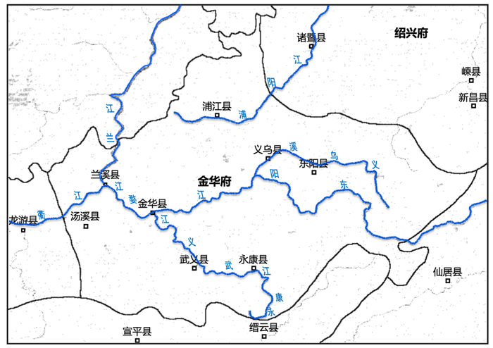 金华位于浙江中部的金衢盆地之中,古称婺州,明清金华府领金华、兰溪、东阳、义乌、永康、武义、浦江、汤溪八县,因有“八婺”之称。金华府各县,除浦江属浦阳江流域之外,其他县区均在婺江(金华江)干流或各个支流之上(图一),水陆交通便利、文化交流频繁。金华拥有丰富的文化遗产资源,其乡村遗产更是浙中地域文化的突出体现。东阳卢宅、兰溪诸葛村、武义俞源村等重要乡土建筑和传统村落一直备受关注,也成为金华乡村的“金字招牌”。