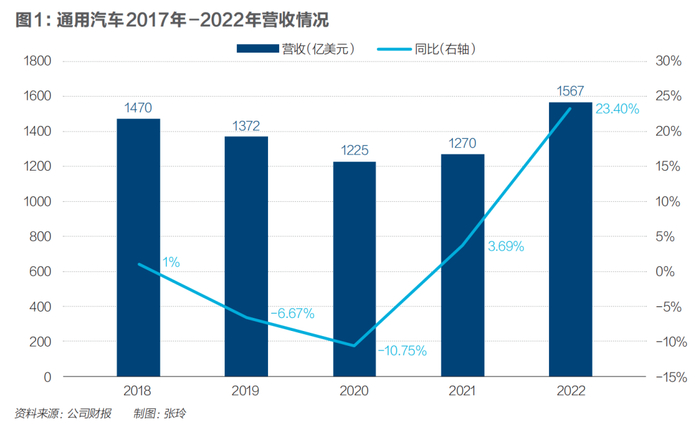 2022年,通用全年营收为1567.4亿美元,同比增长23.4%。而纵观2018年-2021年,通用的营收增长率分别为1%、-6.67%、 -10.75%、3.69%,2022年的增速是过去五年来首次超过20%。