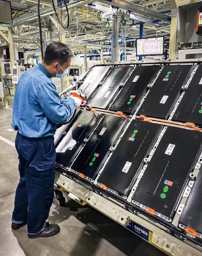 上汽通用上海奥特能工厂车间。奥特能平台具有高度的灵活性,将电芯进行布局组合,可打造不同品牌、不同大小的车型。摄影/《财经》记者王静仪