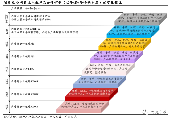 2) 好公司, 医用导管领军企业公司深耕医用导管行业, 持续加大研发投入, 适当产业整合并购, 产品不断丰富, 产品逐步升级。同时公司生产自动化能力不断加强。近年来公司推出可视双腔支气管插管(实现插管可视化, 拥有一定的技术壁垒) 、 负压清石鞘等创新产品, 截止 2022 年上半年度又有 5 个新产品(一次性使用可视双腔支气管插管套件、 亲水涂层聚氯乙烯导尿管套件、 亲水涂层硅胶导尿管套件、 一次性使用热湿交换过滤器套件、 一次性使用泌尿道用导丝) 获得医疗器械注册证。目前, 公司在各细分领域均实现技术领先, 持续提高品 牌影响力和产品终端销售。独家代理的 Bactiguard AB BIP 导尿管国 内三类证延续获批后进一步巩固公司该领域竞争优势(截至目前为止, BIP 导尿管为国内唯一获得三类医疗器械注册证的抗菌导尿管) 。且公司持续研发投入, 新创新管线丰富, 创新产品升级换代且不断丰富, 有望驱动公司业绩持续快速增长。另外, 2021 年底, 公司收购苏州麦德迅51.4743%股权, 其成为公司控股子公司, 继续丰富了公司麻醉领域产品结构, 2022 年中报并表。生产方面, 公司持续进行生产自动化升级和改造。截止 2022 年中报, 公司投入使用的自动化项目有阀气泡线组装设备、 单向阀组装设备、 乳胶导尿管装配线、 雾化罐组装机、 杨克打包机、 插管打包机、 单向阀自动检测机、 注射硫化自动取模和插针等共计 13 项, 进一步提升了生产效率和产品质量稳定性。新投入建设的自动化项目共 10 项, 包括杨克把手自动取放、 雾化面罩自动组装线、儿童型导尿管成型设备、 硅胶导尿管组装设备、 硅胶导尿套自动成型设备等项目。内销方面, 公司进行的营销改革能实现更多产品的放量。 公司进行营销改革, 结合公司重磅产品的产品竞争力, 增加学术推广活动数量, 推动新入院数量的增长, 利用重磅产品进入新医院后, 可以带动公司的其他产品的销售, 进而实现境内市场销售的进一步增长。同时, 公司原本采取一个营销团队负责多条业务线的形式进行营销, 难以实现销售的专业化。近年来公司逐步改革内销营销模式,采用不同的营销队伍负责不同的产品的模式分线销售, 并注重对销售人员的培训和考核, 营销团队的专业性有所提升。外销方面, 绑定大客户并规划提前布局。 公司利用技术产能优势积极争取大客户的非标定制产品项目, 为海外 大客户提供整体解决方案, 目前 多个项目处于技术研发阶段, 后面有望陆续商业落地贡献业绩。同时, 公司计划进一步增加对于海外市场营销的提前布局, 选取重点地区新建海外本土化营销团队, 如在欧洲设立销售子公司等, 加大新客户的开发及新产品的终端推广力度, 进一步改善同海外大客户或经销商的关系, 提高沟通效率, 为海外大客户提供整体解决方案。股权激励表明管理层对于业绩增长有信心。按照公司于 2021 年进行的股权激励解锁行权条件来计算, 100%解锁条件为 2022-2024 年扣非归母净利累计不低于 1.56、 3.58、 6.20 亿元。综上, 公司主要产品属于手术用耗材, 产品在临床上广泛应用于手术、 治疗、 急救和护理等医疗领域。短期看, 2023 年 1 月份以来, 近两年受疫情影响的可择期手术预期逐步恢复, 手术用耗材需求亦将随之增长。 长远来看, 随着现代科技发展、 世界人口平均寿命不断增加和老龄化趋势加剧,手术、 治疗、 急救和护理等医疗领域医疗耗材需求不减。目前来公司产品所在细分市场竞争比较分散, 公司市场占有率仍有较大的提升空间。内销方面, 公司基于各产品线产品特点与市场渠道的差异性, 2020 年开始整合市场渠道和销售人员, 2021 年实现国内营销分线销售。根据公司 2022 年中报显示, 公司产品已有效覆盖全国所有省区, 产品进入国内超过 4,000 家医院, 其中三甲医院1,000 家以上。随着新医改政策落实、 医械国产替代化进程加快, 公司产品力进一步提升等多因素驱动下, 预计公司产品市场占有率将进一步提升。外销方面。公司深度绑定核心大客户, 公司利用技术产能优势积极争取大客户的非标定制产品项目,为海外大客户提供整体解决方案。股权激励解锁条件的业绩高增长更是彰显公司管理层经营信心。我们从短中长期三个时间维度分析了公司增长趋势, 看好公司价值。