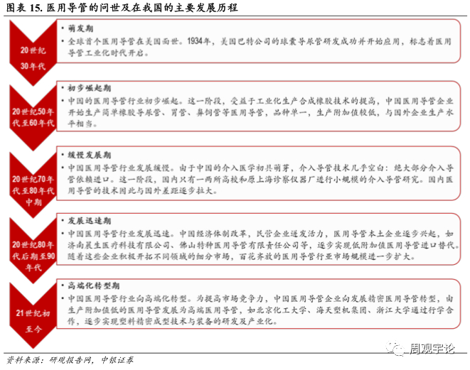医用导管行业:基础性医疗耗材, 需求不减。 医用导管属于基础性医疗器械产品, 在诊断、 治疗、监护、 急救、 引流、 灌流、 气体输送、 血液输送、 康复中被广泛应用。随着现代科技的发展以及世界人口平均寿命不断增长和老龄化趋势加剧, 医用导管在现代医学诊疗和家庭护理中应用的范围有望不断扩大, 重要性不断提升, 行业未来发展潜力较大。另外, 社会发展和科技进步提升人类对健康的需求, 临床医学微创及无创技术的广泛使用, 驱动医用导管研发、 生产和制造技术快速发展,越来越多的新材料、 新技术和新工艺应用于医用导管的生产和制造。产品越来越精细化、 科技化及人性化, 使用越来越简洁、 方便, 从诊疗、 救护等传统医学领域向家庭护理、 个人保健等领域延伸,应用领域和使用范围持续扩大。