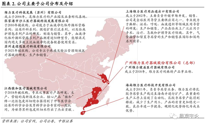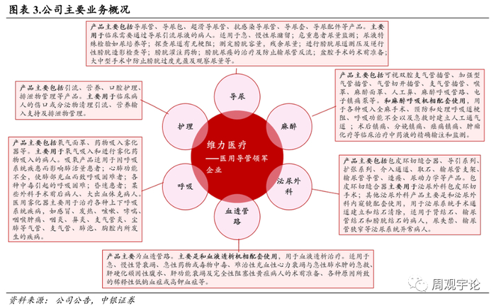 公司产品在临床上广泛应用于手术、治疗、急救和护理等医疗领域。公司自成立以来,主营业务规模不断扩大,产品线不断拓宽。公司通过设立或收购方式,拥有多家子公司,并负责各自的业务范围。其中,苏州麦德迅医疗科技有限公司专注于疼痛及输注管理领域医疗器械的研发、生产和销售;海南维力医疗科技开发有限公司负责导尿管业务,拥有乳胶导尿管自动化生产线,可以高速生产乳胶导尿管;江西狼和医疗器械有限公司专注于医疗产品,核心产品“狼和”牌一次性包皮环切缝合器,属于国内行业龙头;张家港市沙工医疗器械科技发展有限公司是国内最早一批获得血透管路注册证的企业之一,产品质量稳定,拥有良好的品牌知名度。