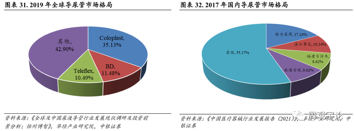 维力医疗在国内导尿领域处于龙头地位。据北京恒州博智信息咨询有限公司 2020-2026 全球及中国尿管行业发展现状调研及投资前景分析报告显示, 全球导尿管行业主要生产商有 Coloplast, BD 和Teleflex, 2019 年其收入占比分别为 35.13%, 11.48%和 10.49%。另外, 据《中国医疗器械行业发展报告(2021) 》 显示, 国内导尿管企业普遍规模较小, 产能分布较为分散, 据 NMPA 数据国内导尿管产品企业已近 150 家, 2017 年, 维力医疗、 湛江事达产能规模占比分别为 17.24%、 10.34%。
