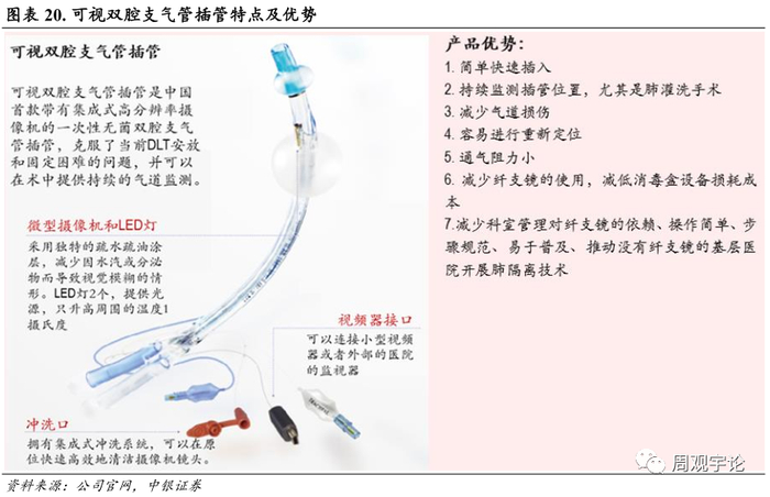 可视双腔支气管插管等可视系列创新性产品, 解决了肺隔离手术定位难题, 产品于 2020 年成功推入《2020 版中国麻醉学指南与专家共识》 。可视双腔支气管插管具有全程可视精准可控、 可以在没有纤支镜的基层医院使用, 使基层医院也能开展肺隔离技术等优点。