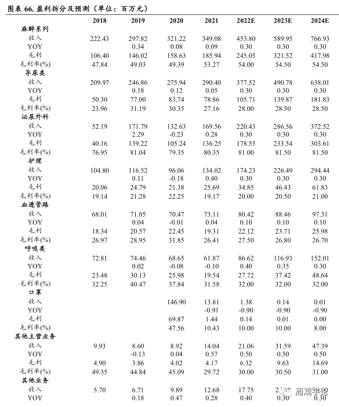 1)麻醉线:防疫政策放开,预期医院、常规诊疗、择期手术恢复,受明星单品可视双腔支气管插管、一次性镇痛储液盒重磅产品销售拉动,预计麻醉线维持高速增长,2022-2024年收入同比增速分别为30%、30%、30%;毛利率随着重磅产品放量及规模化效应略增,分别为 54.00%、54.50%、54.50%;