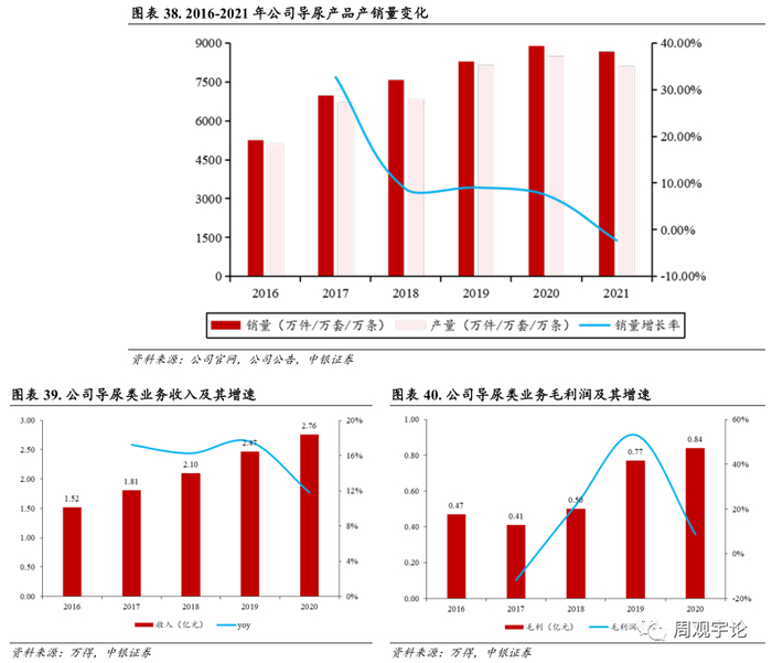 在公司传统领域的导尿产品线, 公司正在大力推广具有较高毛利率的一次性使用导尿包产品。根据公司 2021 年报, 公司重点推广产品超滑导尿包在 2021 年新进医院 171 家。除了传统的导尿业务之外, 公司大力发展毛利率较高的麻醉产品线和泌尿外科产品线。这两条毛利率较高的产品线的占比正在逐渐提升, 且毛利率维持在相对稳定的高位, 与公司传统的导尿类产品维持在 30%左右的毛利率相比, 公司新发力的麻醉业务的毛利率可达 50%左右, 泌尿外科的毛利率可达 80%。