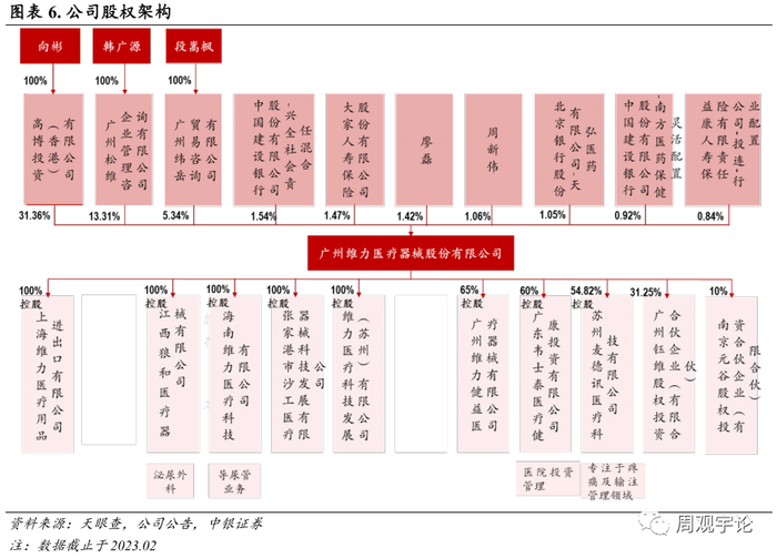 截止2023年2月,高博投资(香港)有限公司持有的公司股份比例为 31.36%, 为公司的控股股东。维力医疗董事长向彬是公司的实际控制人。另外, 广州松维持有公司 13.32%股权;广州纬岳持有公司 5.34%股权。公司核心管理团队为向彬、 韩广源和段嵩枫, 深耕行业多年, 产业背景丰富。