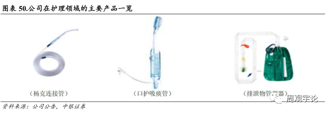 公司护理产品主要包括引流、 营养、 口腔护理、 排泄物管理等产品, 主要用于临床病人的伤口或分泌物清理引流以及重症病人的口腔及排泄物护理。