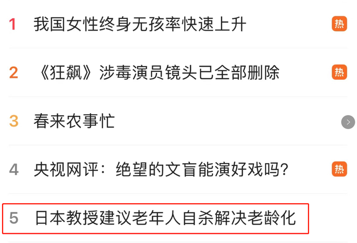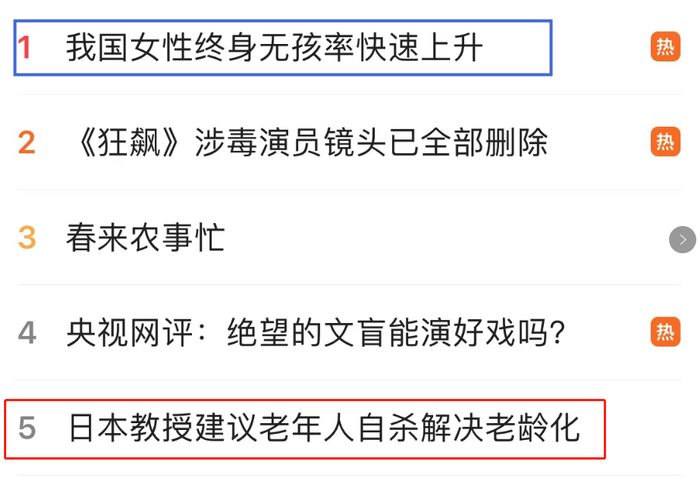 复盘文首我放的热搜榜,你会发现日本专家的魔性建议才排第五,排行第一的是《我国女性终身无孩率快速上升》。