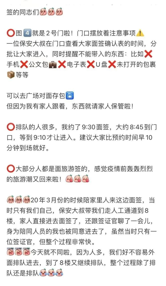记者在小红书上看到的网友分享,近日在上海面签时排队的人很多,“大部分是面旅游签的,感觉轰轰烈烈的旅游潮又回来了。”
